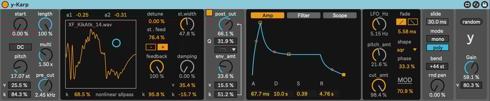 Introducing y-Karp , a Max for Live Karplus Strong synthesis device. Synthesis starts with an impulse derived from a short sample which is dropped on the device (tip: kicks or noise work well). This is fed into a delay line (positive or negative feedback) which has a low pass filter for damping and a nonlinear all pass filter for a kind of phase distortion.